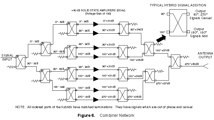 Since hybrid circuits are bi-directional, they can be used to split up a signal to feed multiple low power amplifiers, then recombine to feed a single antenna with high power as shown in Figure 6.