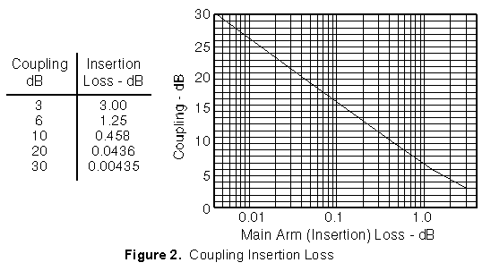 The actual directional coupler loss will be a combination of coupling loss, dielectric loss, conductor loss, and VSWR loss. Depending on the frequency range, coupling loss becomes less significant above 15 dB coupling where the other losses constitute the majority of the total loss. A graph of the theoretical insertion loss (dB) vs coupling (dB) for a dissipationless coupler is shown in Figure 2.