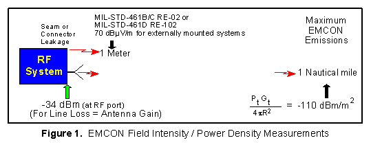 If MIL-STD-461B/C RE02 (or MIL-STD-461D RE-102) measurements (see Figure 2) are made on seam/connector leakage of a system, emissions below 70 dBµV/meter which are measured at one meter will meet the EMCON requirement. Note that the airframe provides attenuation so portions of systems mounted inside an aircraft that measure 90 dBµV/meter will still meet EMCON if the airframe provides 20 dB of shielding (note that the requirement at one nm is converted to what would be measured at one meter from a point source)
