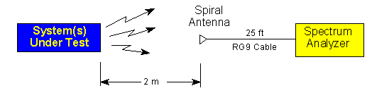 Suppose that we want to make a very general estimation regarding the ability of a system to meet EMCON requirements. We choose to use a spiral antenna for measurements and take one of our samples at 4 GHz. Since we know the gain of the spiral is relatively flat at 4 GHz and has a gain value of approximately one (0 dB) in that frequency range. The antenna is connected to a spectrum analyzer by 25 feet of RG9 cable. We want to take our measurements at 2 meters from the system so our setup is shown below: