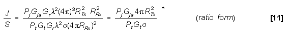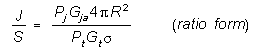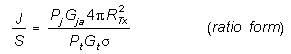 J-S Ratio (Monostatic) The ratio of the power received (Pr1 or J) from the jamming signal transmitted from the target to the power received (Pr2 or S) from the radar skin return from the target equals J/S.