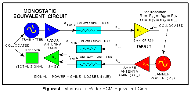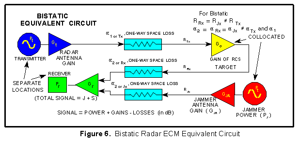 J-to-S Ratio (Bistatic) When the radar's transmit antenna is located remotely from the receiving antenna (Figure 6), the ratio of the power received (Pr1 or J) from the jamming signal transmitted from the target to the power received (Pr2 or S) from the radar skin return from the target equals J/S. For jammer effectiveness J normally has to be greater than S.