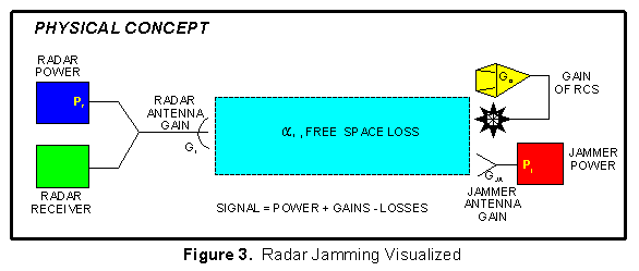 Figure 3 is radar jamming visualized. The Physical concept of Figure 3 shows a monostatic radar that is the same as Figure 1, in the Two-Way Monostatic Radar Equation Section, and a jammer (transmitter) to radar (receiver) that is the same as Figure 3, in the One-Way Radar Equation Section. In other words, Figure 3 is simply the combination of the previous two visual concepts where there is only one receiver (the radar's).