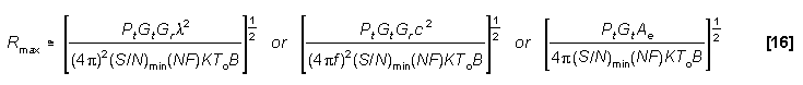 The one-way radar (signal strength) equation [5] is rearranged to calculate the maximum range Rmax of RWR/ESM receivers. It occurs when the received radar signal just equals Smin as follows: