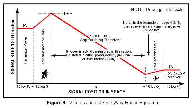 The one-way (transmitter to receiver) radar equation is derived in this section. This equation is most commonly used in RWR or ESM type of applications. The following is a summary of the important equations explored in this section: