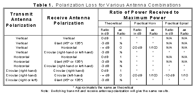 Table 1 shows the theoretical ratio of power transmitted between antennas of different polarization. These ratios are seldom fully achieved due to effects such as reflection, refraction, and other wave interactions, so some practical ratios are also included.