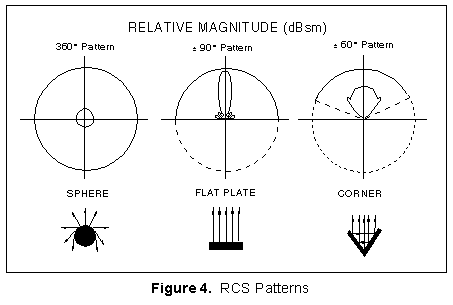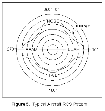 Again, Figure 5 shows that these values can vary dramatically. The strongest return depicted in the example is 100 m2 in the beam, and the weakest is slightly more than 1 m2 in the 135°/225° positions. These RCS values can be very misleading because other factors may affect the results. For example, phase differences, polarization, surface imperfections, and material type all greatly affect the results. In the above typical bomber example, the measured RCS may be much greater than 1000 square meters in certain circumstances (90°, 270°).