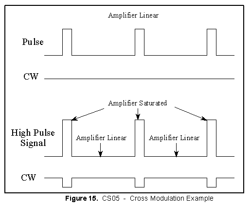 When an amplifier is operated in the linear region all signals receive the rated linear gain. In this test the pulse signal will cause the amplifier to kick in and out of saturation and modulate the weak CW signal. The receiver may measure the modulation on the CW signal and incorrectly identify it as a pulse signal.