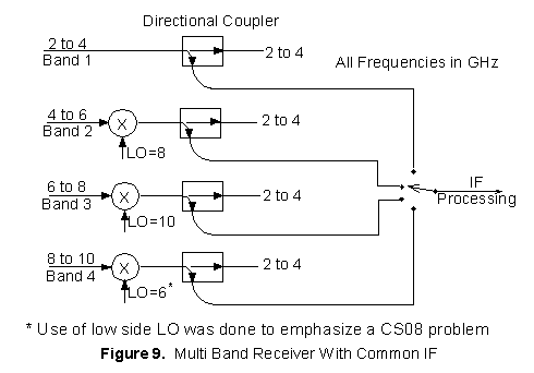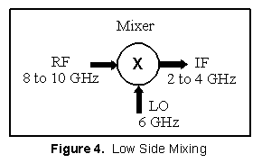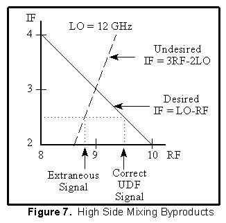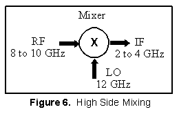 The use of double mixing, as shown in Figure 8, can significantly reduce unwanted signals but it is more expensive. For a 8 GHz signal in, one still generates a 2 GHz IF but by mixing up, then down, unwanted signals are not generated or significantly suppressed.