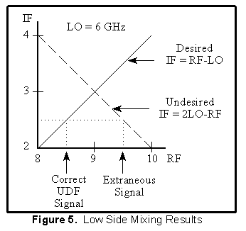The same 2.5 GHz signal can result from an RF signal of 9.5 GHz due to mixing with the second harmonic of the LO i.e., 2 X 6 - 9.5 = 2.5 GHz. This signal will be substantially attenuated (approximately 35 dB) when compared to the normal IF of 9.5 - 6 = 3.5 GHz. If the receiver has filters at the IF to reduce the signal density and a filter has minimum insertion loss at 2.5 GHz and maximum insertion loss at 3.5 GHz, then only the low level 2.5 GHz signal will be measured and assumed to be due to a 8.5 GHz input signal whereas the input is really at 9.5 GHz.