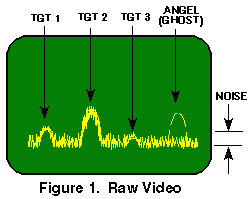 In Figure 1, an operator could readily identify three targets and a ghost (a ghost is a phony target that usually fades in and out and could be caused by birds, weather, or odd temporary reflections - also referred to as an angel). Target 3 is a weak return and hidden in the noise - an operator can identify it as a target by the "mouse under the rug" effect of raising the noise base line.