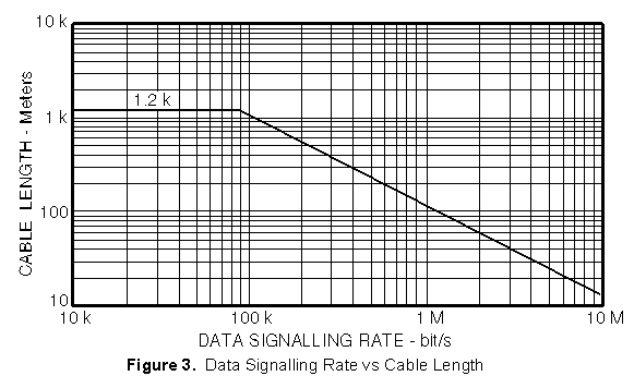 The maximum permissible length of cable separating the generator and the load is a function of data signalling rate and is influenced by the tolerable signal distortion, the amount of coupled noise and ground potential difference introduced between the generator and load circuit as well as by cable balance. The curve of cable length versus signalling rate is given in Figure 3. This curve is based upon using 24 AWG copper, twisted-pair cable with a capacitance of 52.5 pF/meter terminated in a 100 ohm load. As data signalling rate is reduced below 90 kbit/s, the cable length has been limited at 1200 meters by the assumed maximum allowable 6 dBV signal loss.