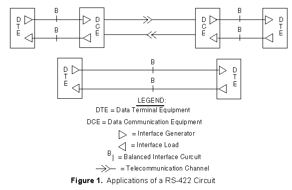 The RS-422-A interfaces between the Data Terminal Equipment (DTE) and Data Communication Equipment (DCE) or in any point-to-point interconnection of signals between digital equipment. It employs the electrical characteristics of balanced-voltage digital interface circuits.