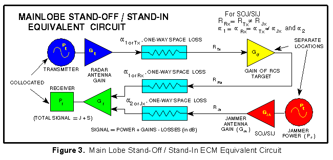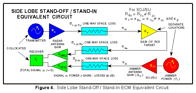 The equivalent circuit shown in Figure 4. It differs from Figure 3, (main lobe SOJ/SIJ) in that the radar receiver antenna gain is different for the radar signal return and the jamming.