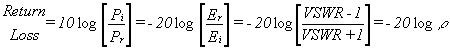For example, an antenna with a VSWR of 2:1 would have a reflection coefficient of 0.333, a mismatch loss of 0.51 dB, and a return loss of 9.54 dB (11% of your transmitter power is reflected back).