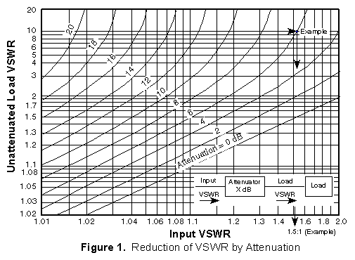 Transmission line attenuation improves the VSWR of a load or antenna. For example, a transmitting antenna with a VSWR of 10:1 (poor) and a line loss of 6 dB would measure 1.5:1 (okay) if measured at the transmitter. Figure 1 shows this effect.