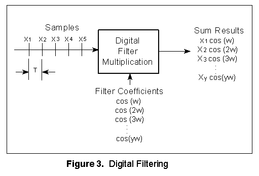 If the digital information is multiplied by the Fourier coefficients, a digital filter is created as shown Figure 3. If the sum of the resultant components is zero, the filter has ignored (notched out) that frequency sample. If the sum is a relatively large number, the filter has passed the signal. With the single sinusoid shown, there should be only one resultant. (Note that being "zero" and relatively large may just mean below or above the filters cutoff threshold)
