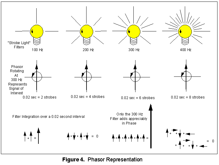 Figure 4 depicts the process pictorially: The vectors in the figure just happen to be pointing in a cardinal direction because the strobe frequencies are all multiples of the vector (phasor) rotation rate, but that is not normally the case. Usually the vectors will point in a number of different directions, with a resultant in some direction other than straight up.