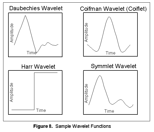 Fourier transforms deal with just two basis functions (sine and cosine), while there are an infinite number of wavelet basis functions. The freedom of the analyzing wavelet is a major difference between the two types of analyses and is important in determining the results of the analysis. The "wrong" wavelet may be no better (or even far worse than) than the Fourier analysis. A successful application presupposes some expertise on the part of the user. Some prior knowledge about the signal must generally be known in order to select the most suitable distribution and adapt the parameters to the signal. Some of the more common ones are shown in Figure 8.