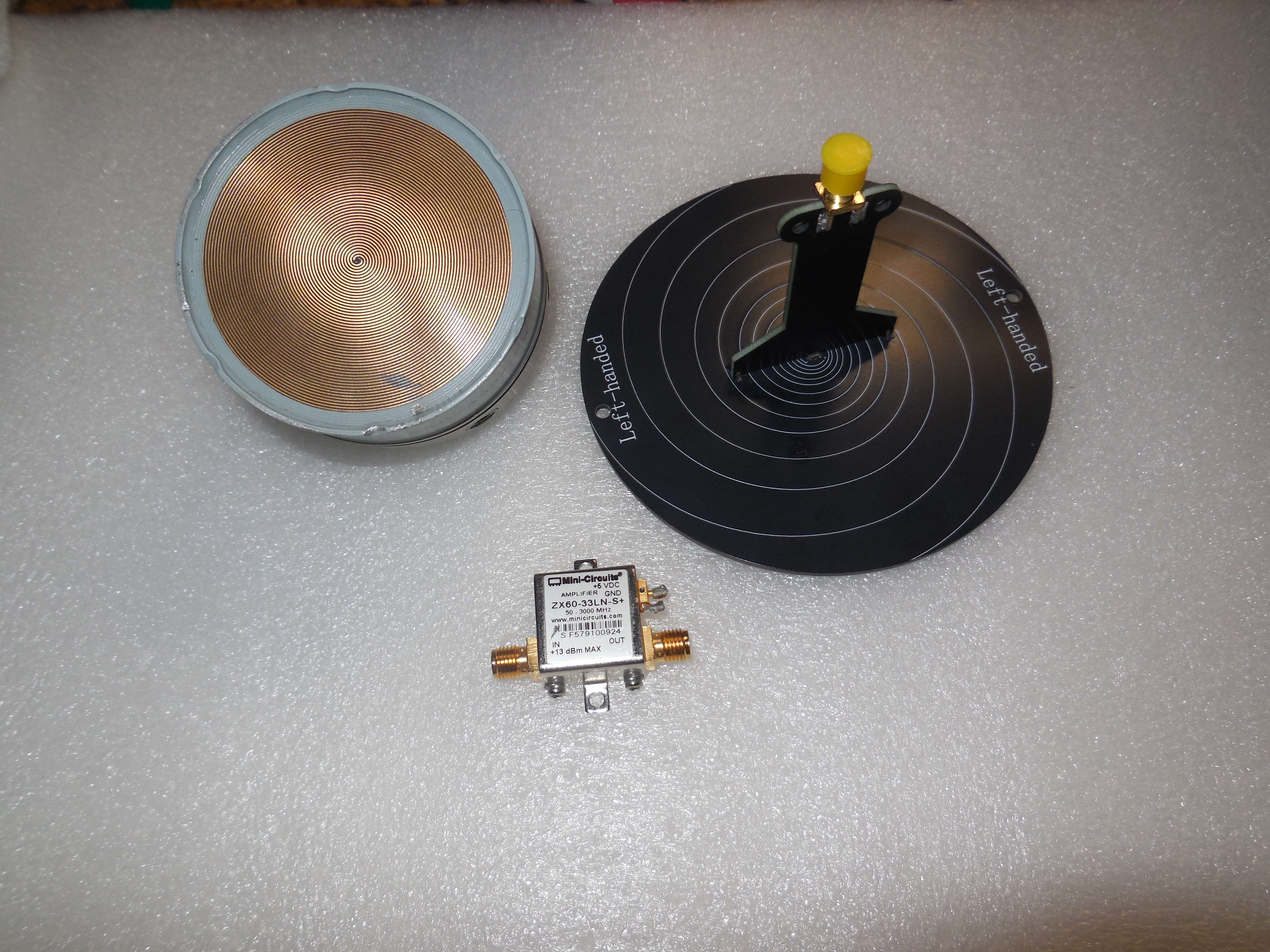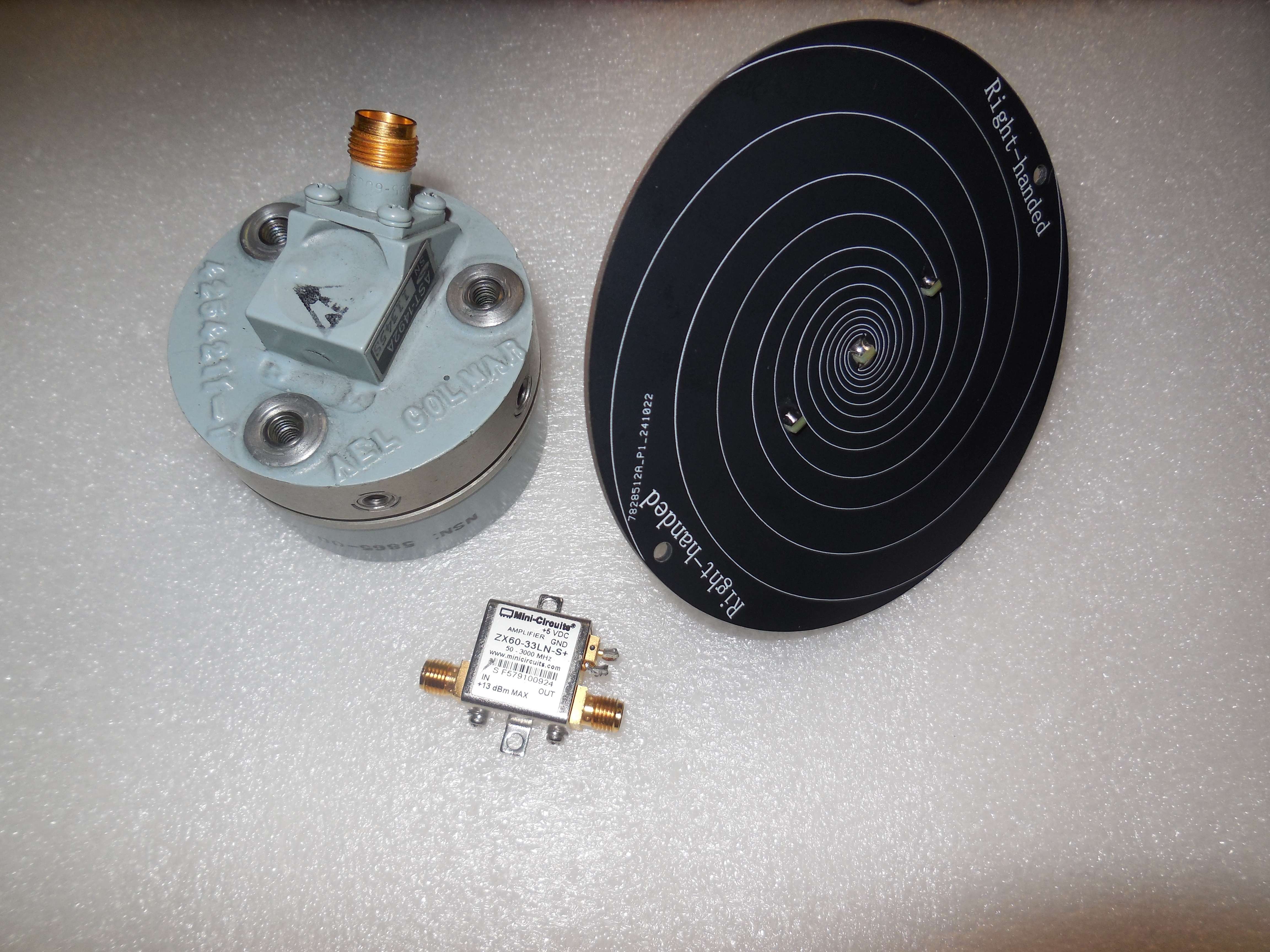 On the right is an inexpensive 1-10 GHz circular-polarized antenna you can buy on eBay for around $40. You change the polarity (left/right) by swapping which side the feed is on. Replace the PC board feed with a piece of UT-141 semi-rigid coax for better performance at microwave frequencies and easier mounting.