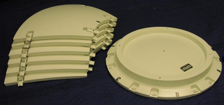 The four-foot parabolic dish is designed to be broken down (without tools) into several smaller sections for concealment and transportation. Pacific Radomes is a manufacture of high-quality portable segmented parabolic reflectors.