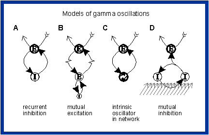 MechanismsIntroductionSeveral theories exist for the generation of gamma oscillations in various parts of the brain. They all need further experimental testing. It is possible that gamma oscillations arise by different mechanisms in different parts of the brain, and that several mechanisms combine in individual regions. The cartoons in the figure are highly simplified representations of some of their components. We will consider the various mechanisms roughly in chronological order, and indicate the main regions where they have been implicated immediately after their respective headings. ![]() Feedback loops between excitatory and inhibitory neurons (olfactory bulb, piriform cortex, entorhinal cortex, primary visual cortex). Freeman and colleagues developed a model for induced rhythms in several olfactory structures, which proposed that the synchronous oscillation is generated by a feedback loop between excitatory and inhibitory neurons [2]. They proposed that some mutual connectivity was also required within the pools of both excitatory and inhibitory neurons to stabilize the oscillations. Ermentrout [3] has shown that mutual excitation amongst the excitatory neurons is necessary for stable oscillations to be generated by a recurrent inhibitory loop. However, our recent simulations suggest that other conditions may suffice for stable oscillations (R.D. Traub, unpublished). Freeman et al [2] predicted that inhibitory cells should lag behind the excitatory by 0.25 cycle (6.5 ms at 40 Hz). Experimental support came from single unit and EEG recordings in vivo from: olfactory bulb, anterior olfactory nucleus, prepiriform cortex, and entorhinal cortex [2]. The signals fell into two groups: one set fired in phase with the gamma EEG, and one led or lagged by 0.25 cycle; unfortunately these measurements cannot identify the neurons in each group. In contrast, hippocampal interneurons recorded during gamma fire in phase with pyramidal cells [1]. This is predicted by our inhibitory network model (see below), both when isolated from the excitatory network [13], and when connected with pyramidal cells (Traub et al, unpublished simulations). Why the hippocampal and superficially similar olfactory cortical circuitry should differ remains unclear [2]. Wilson and Bower made similar models of piriform cortex [14] and primary visual cortex [15]. The geometric structure of these models differed, but the essential idea in both was that the amplitude and frequency of coherent 30-60 Hz oscillations evoked by afferent volleys were determined or "tuned" by a fast feedback inhibitory loop (Fig. A). Essentially, if the stimulus is appropriate (not too strong), enough activity in the recurrent excitatory connections between pyramidal cells persists after recurrent inhibition wanes in order to re-excite the pyramidal cell population. In the case of the piriform cortex model, they showed that the time constant of inhibition "tuned" the frequency of the gamma rhythm, so that longer open times for the chloride channels resulted in slower rhythms (and also a loss of power). In their model of the primary visual cortex Wilson and Bower [15] note in passing that local mutual inhibition between the interneurons "...improved frequency locking and produced auto- and cross-correlations with more pronounced oscillatory characteristics". This differs from the central role of the same kinds of connections in the generation of gamma rhythms in the hippocampus where they were both necessary and sufficient [11,13]. In the visual cortex model horizontal pyramidal cell axons were essential for long range (upwards of 1mm) cross correlations [15]. These had zero phase lag as long as the EPSPs they generated were not too strong. Stronger EPSPs result in phase lags consistent with axonal conduction delays, while weaker ones were reminiscent of other kinds of loosely-coupled oscillators. In both the visual cortex and the piriform cortex versions of this model, gamma rhythms: arose from interactions between networks of excitatory neurons, could depend on the conduction velocities of intrinsic cortical connections (Fig. 2B), and were tuned by the time constants of excitatory and inhibitory synapses. We are not aware of any attempts to dissect these complex interactions experimentally; in particular an investigation of the effects of conduction delays on cortical oscillations would be instructive. Intrinsic oscillations in individual neurons (thalamus, neocortex; Fig. 2C). Neurons in many parts of the brain have the intrinsic capacity to oscillate at about 40 Hz. Several types of neuron in the thalamocortical system do so, e.g. reticular [9] and intralaminar [10] neurons. In neocortex itself, intrinsic cellular oscillators include: sparsely spiny layer 4 neurons [6], about 20% of long axon projection neurons in layers 5 and 6 [8], and "chattering cells" (that fire brief trains of action potentials at 200Hz about 40 times a second) recently reported in vivo [7]. Slice studies revealed that 40 Hz oscillations in sparsely spiny neurons in frontal cortex are generated by voltage-dependent persistent sodium and delayed rectifier currents [6]. Other frontal cortex neurons use fast persistent sodium currents, leak and slow non-inactivating potassium currents to generate 4-20 Hz [4]; models suggest that similar mechanisms can generate 40 Hz [12]. At least some cortical neurons with intrinsic oscillator mechanisms project to contralateral areas, and to the thalamus, providing routes for long range synchronisation of these oscillations [8]. The existence of cells with intrinsic oscillations at 40 Hz does not in itself explain the synchronization of local populations of neurons, but it is likely to pace population rhythms when the neurons are suitably coupled by chemical and/or electrical synapses [5]. Bibliography1 Bragin, A., Jand , G., N dasdy, Z., Hetke, J., Wise, K. and Buzs ki, G. Gamma (40-100 Hz) oscillation in the hippocampus of the behaving ra