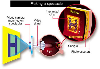 Restoring partial sight using retinal implants Humayun now plans to develop a permanent device with a high enough resolution to restore basic vision. An external video camera (see diagram) contained within a visor will send television images to a chip embedded in the retina. This will translate the video signal into tiny electrical signals on contacts that stimulate the ganglia.