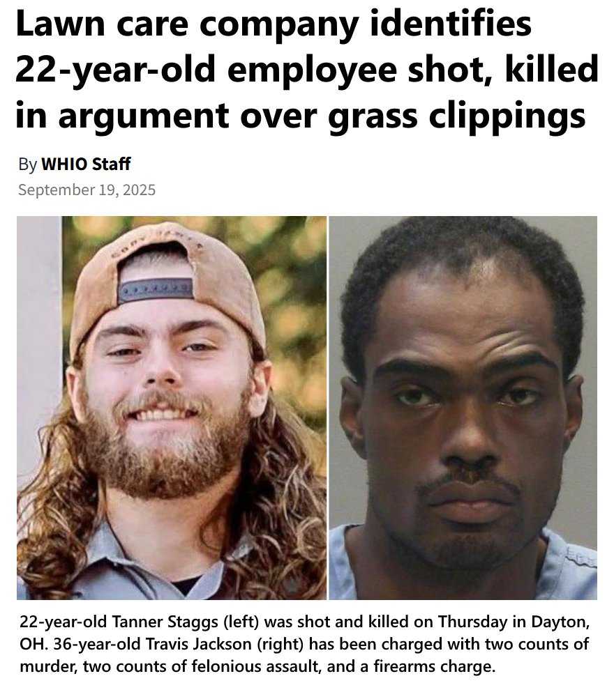 - Ohio Landscaper Shot Dead in Argument Over Grass Cuttings, Say Cops Landscaper Tanner Staggs was shot dead by Travis Jackson. Why? Because some grass clippings had blown onto Jackson's car.