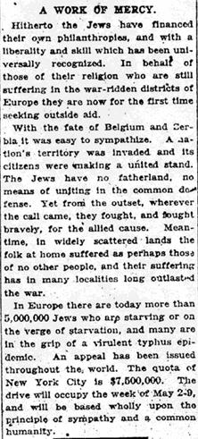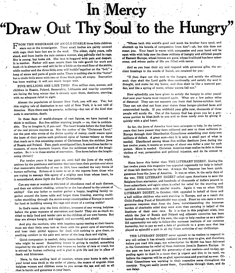 "From across the sea, six million men and women call to us for help [...] six million human beings. [...] Six million men and women are dying [...] in the threatened holocaust of human life [...] six million famished men and women. Six million men and women are dying [...]" The American Hebrew, Oct. 31, 1919, pp. 582f.