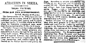 "According to reliable information, the victims of the Austrians and Bulgarians exceeded 700,000. [...] Women, children, and old men were shut up in the churches by the Austrians, and either stabbed with bayonet or suffocated by means of asphyxiating gas." The Daily Telegraph, March 22, 1916, p. 7