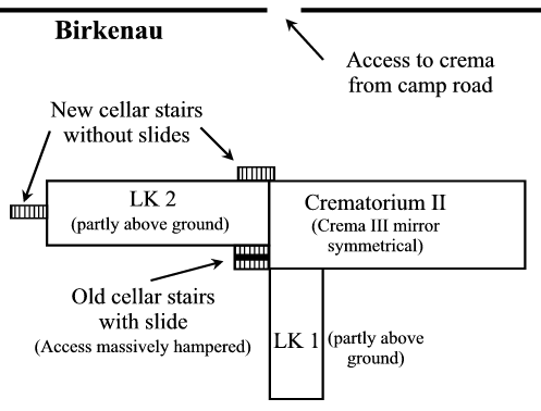 According to eyewitness accounts, a homicidal gas chamber is supposed to have existed in the crematorium of Auschwitz I; this location still exists today, intact, but has been the object of serious manipulation, as we shall see. Additional homicidal gas chambers are said to have existed in the Birkenau camp, Auschwitz II, located approximately three kilometers away. These gas chambers were allegedly located in the four crematoria of that camp, as well as in two farmhouses outside the actual camp itself, modified for homicidal gassing purposes.