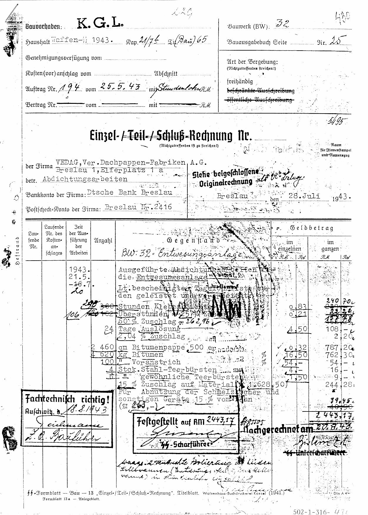[219] | Invoice no. 729 dated May 27, 1943. APMO, D-Z/Bau, nr. inw. 1967, pp. 246f.; ibid., 231f.: invoice no. 171 dated 22. February 1943 for crematorium II. |