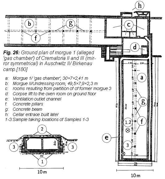 [216] | The ventilation ducts of morgue 1 are visible in the plans published by J.-C. Pressac, op. cit. (note 67), pp. 224, 289; chapter on the ventilation installations of crematoria II and III: ibid., pp. 355ff.; engine power of the ventilation installations for all rooms in crematoria II and III: ibid., p. 374 and 377; size of the ventilation outlets: ibid., p. 234; Fig. of an outlet cover in the ventilation outlets. |