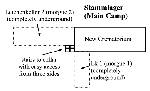 It was not uncommon for a crematorium to be installed in the same building complex, as may still be seen at Dachau concentration camp today (near Munich), in which the new hygienic installation possesses a series of DEGESCH circulating air installations for the disinfestation of clothing, with an undressing and redressing room to the right and left of the inmate showers, as well as a crematorium. (The room described as a "gas chamber" at Dachau today is actually the inmate shower, which is indispensable in the above schema, and which has been intentionally mislabeled by the Museum.)