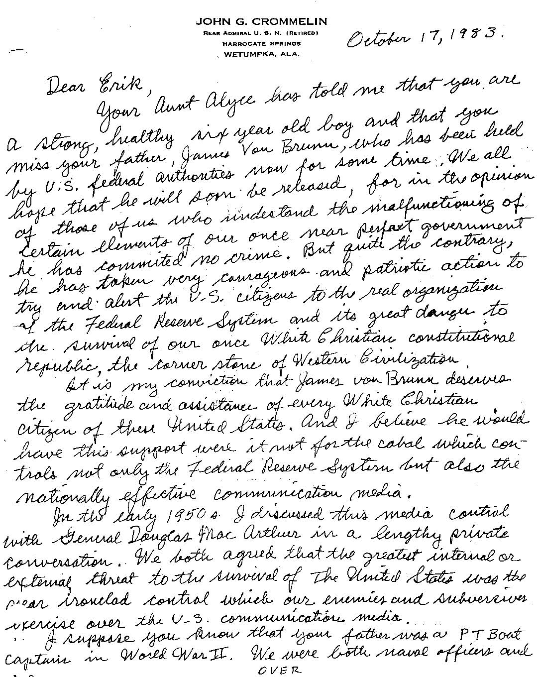 Your Aunt Alyce has told me that you are a strong, healthy six year old boy and that you miss your father, James von Brunn, who has been held by federal authorities now for some time. We all hope that he will soon now be released, for in the opinion of those of us who understand the malfunctioning of certain elements of our once near perfect government he has committed no crime. But quite the contrary, he has taken very courageous and patriotic actions to try to alert the U.S. citizen to the real organization of the Federal Reserve System and its great danger to the survival of our once White Christian constitutional republic, the cornerstone of Western Civilization.