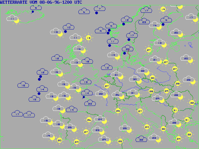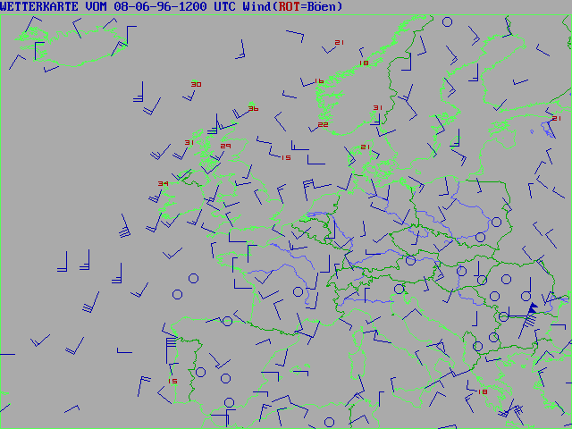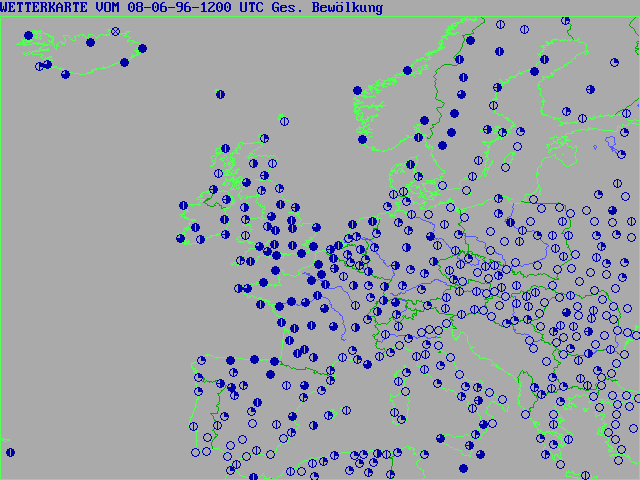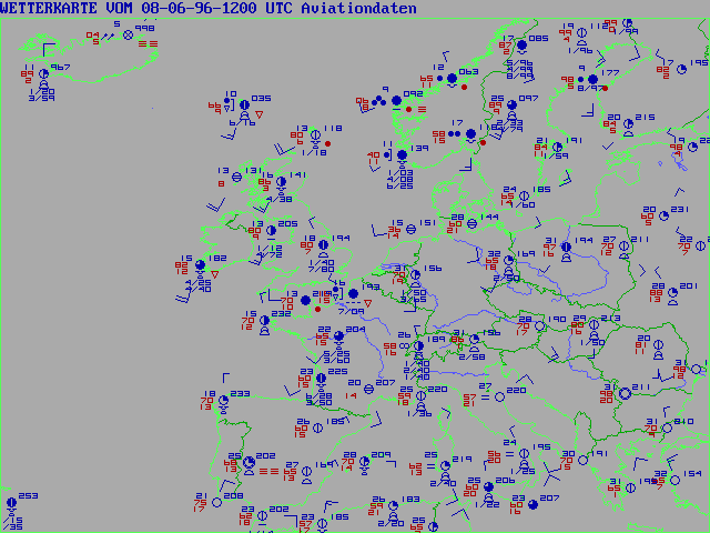 Here are some example maps from Europe, Sunday 08-06-96 1200 UTC (a "tropical" day here in Germany) represents reports FM 13 (Ships) and FM 11 (Land Stations) plotted with the German version Supra PC SYNOP 5.2: