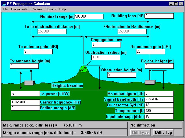 RFProp is a Windows propagation calculator for the transmission path between an RF transmitter and a receiver. It is aimed mainly at free-space and space-wave applications, such as are encountered in VHF, UHF and microwave communications, and also in satellite communications. A knife-edge diffraction calculation is also included which when enabled allows the effects of a hill or other obstruction to be taken into account.