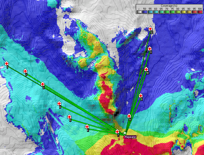 6-The repeater can be placed at the previous location and we observe again that 7 of the 12 sites are covered from there.