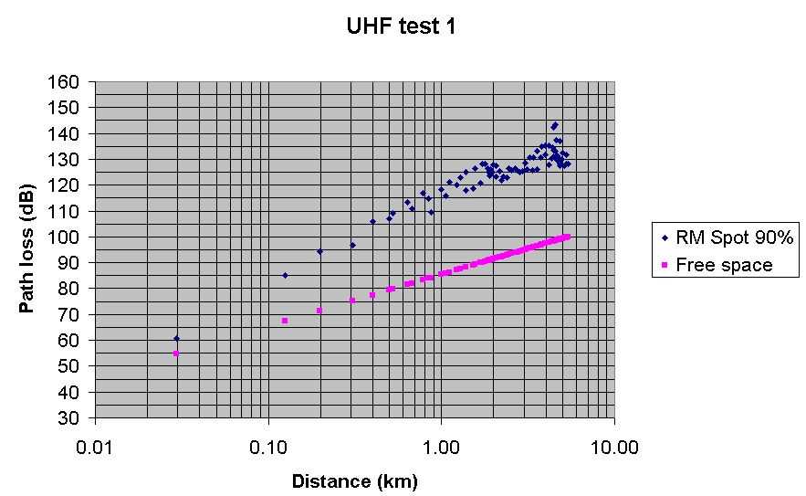 Test 1 UHF Radio Mobile predicted path loss with Spot at 90%