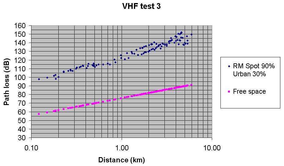 Test 3 VHF Radio Mobile predicted path loss with Spot at 90% and City at 30%