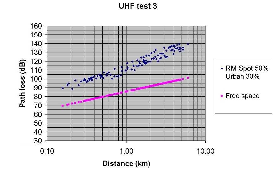 Test 3 UHF Radio Mobile predicted path loss with Spot at 50% and City at 30%
