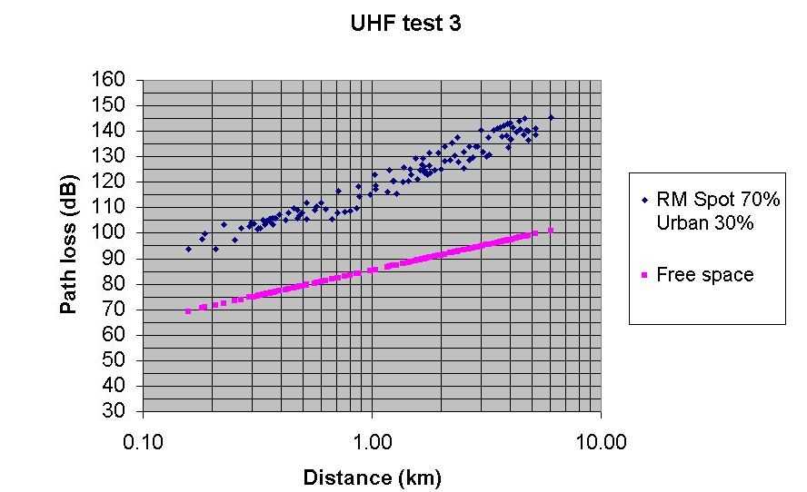 Test 3 UHF Radio Mobile predicted path loss with Spot at 70% and City at 30% Best fit