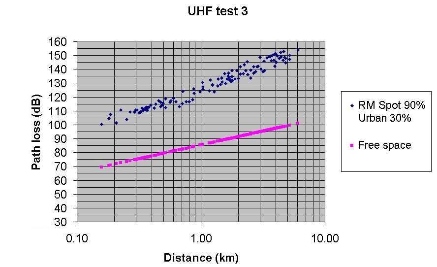 Test 3 UHF Radio Mobile predicted path loss with Spot at 90% and City at 30%