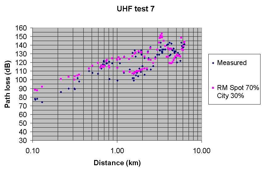 Test 7 VHF measured and predicted path loss comparison with Spot at 70% and City at 30%