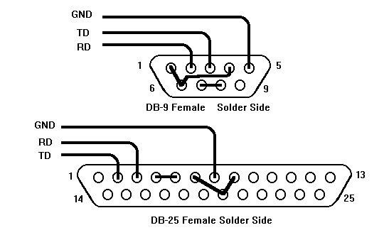 Figure 8. This solder side view shows how to wire the DB-9 (female) or DB-25 (female)