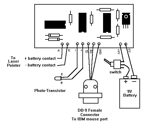 Now you are ready to start attaching the external components. These include the laser pointer, photo-transistor, battery connector, switch and the DB-9 connector. I will leave it up to you as to how you want to house the project, but I suggest that you use a zippy box so that you can mount the photo-transistor and switch. To mount the photo-transistor, you can simply drill a snug hole in the side of the zippy box and use that to secure the photo- transistor. Alternatively a block of plastic or wood, with a hole drilled in it for the photo- transistor, can be attached to the top of the zippy box. The advantage of the block is that it shields the photo-transistor from ambient light. Take particular care with the orientation of the photo-transistor when clipping the pins and soldering wires to it.