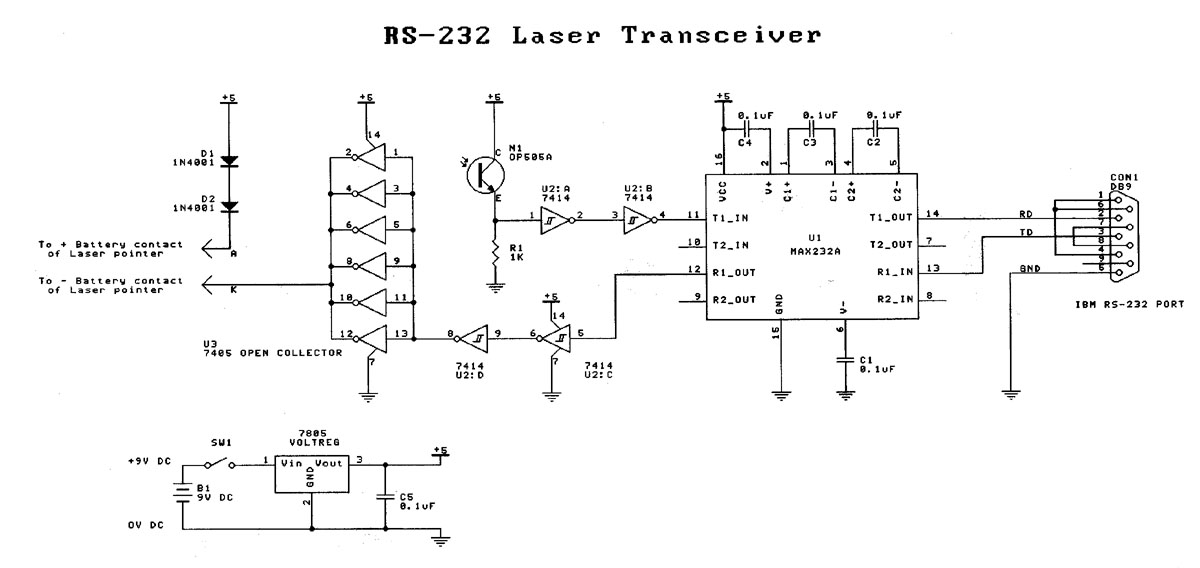 The transceiver is based on the MAX232A IC for generating and receiving RS-232 compatible voltage signals. The receiving sensor is an NPN infrared photo-transistor (OP505A). I chose an infrared photo-transistor to minimise ambient light interference. Although the laser wavelength is in the visible spectrum (~670nm) the photo-transistor’s broad response band (550nm to 1050nm) is wide enough to sense the intense laser beam. The signal from the photo-transistor is buffered via a pair of Schmitt trigger buffers to clean up and square the signal. The output of the second buffer is then directly converted to a RS-232 standard signal via the MAX232A.