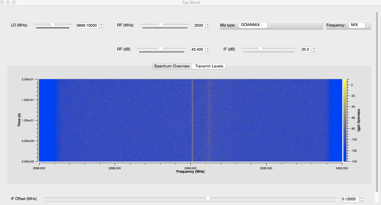 Viewing the down-mixed output (flipped the Frequency chooser to MIX and turned up the RF output). The RF output is amplitude modulated with a tone and the receive port demodulates it. The filter graph calculates the correct receive frequency based on the LO and RF frequency that are set. The receiver can be offset using the IF Offset slider at the bottom, this makes it easy to avoid a spurious signal hat usually appears at the B210 center frequency.