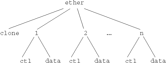 The top directory contains a clone file and a directory for each connection numbered 1 to n. Each connection directory corresponds to an Ethernet packet type. Opening the clone file finds an unused connection directory and opens the ctl file. Reading the control file returns the ASCII connection number, which can be used to construct the name of the proper connection directory.