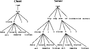 /net/tcp/cloneThe path name identifies the network device; the connect address string is used to set up a connection. To establish the connection, the client then opens /net/tcp/clone and writes the control message into it.
